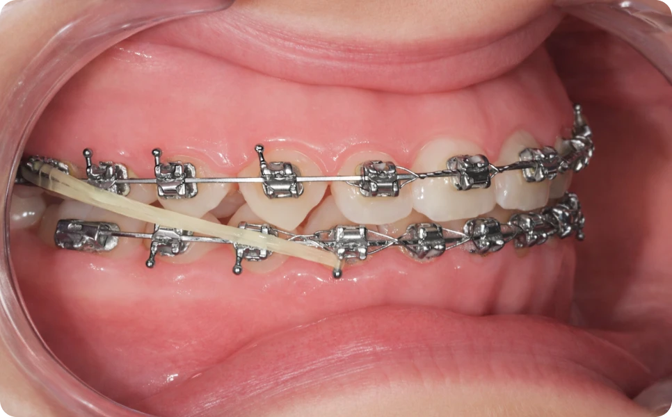 des élastiques sont placés entre certaines dents du haut et certaines dents du bas afin d’exercer une force douce et contrôlée.