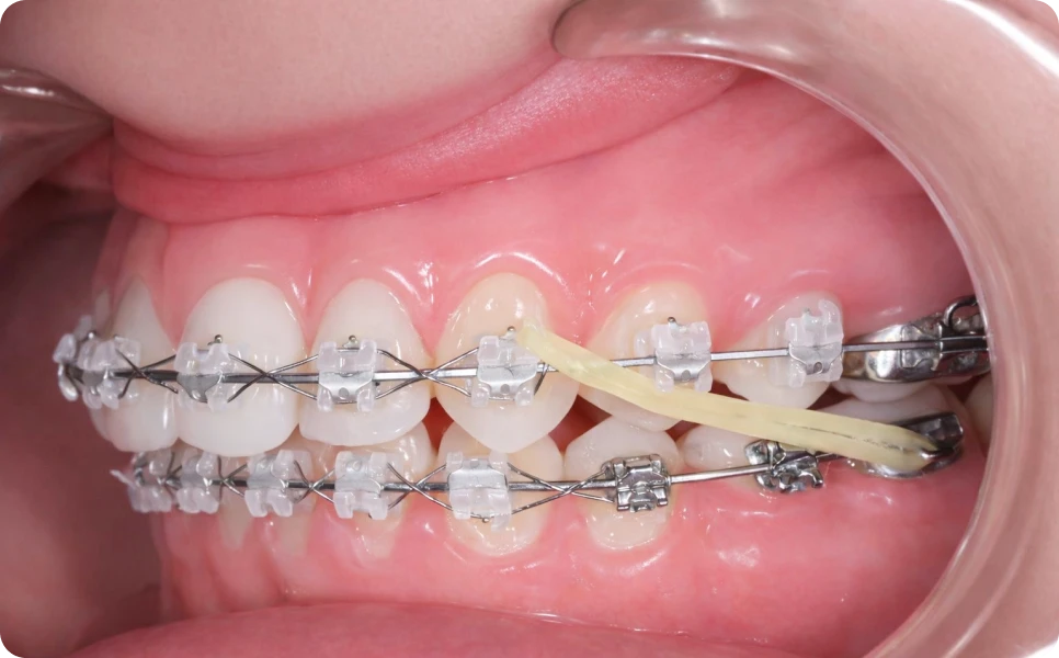 des élastiques sont placés entre certaines dents du haut et certaines dents du bas afin d’exercer une force douce et contrôlée.